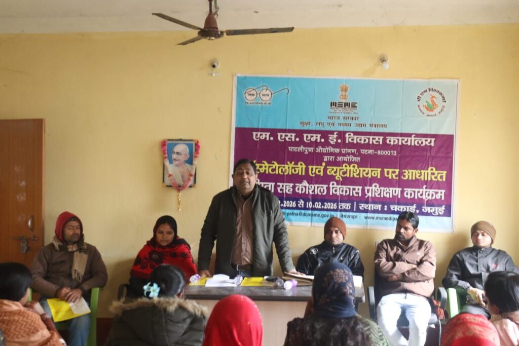 जमुई । जिला अंतर्गत चकाई में भारत सरकार के एमएसएमई मंत्रालय के पटना स्थित एमएसएमई विकास कार्यालय पटना द्वारा सहायक निदेशक श्री सुनील कुमार अग्निहोत्री जी के मार्गदर्शन में 6 सप्ताह तक चलने वाला कॉस्मेटोलॉजी एवं ब्यूटीशियन पर आधारित उद्यमिता कौशल विकास कार्यक्रम का उद्घाटन स्थानीय मुखिया,दिनेश रजक जी ने दीप प्रज्वलित करके किया l