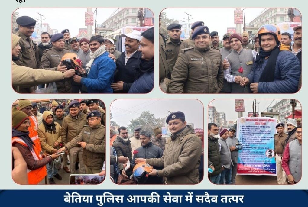 बेतिया । पुलिस अधीक्षक, पश्चिम चंपारण बेतिया के द्वारा सड़क सुरक्षा को लेकर आम जनों के बीच हेलमेट का वितरण किया गया, इसके साथ ही आम जनों को यातायात नियमों के पालन को लेकर जागरूक किया गया । जिन बाइक चालकों ने हेलमेट नहीं पहना था, उन्हें एक-एक हेलमेट के साथ गुलाब का फूल दिया गया और भविष्य में हेलमेट पहन कर ही वाहन चलाने की सलाह दी गई। ट्रैफिक ड्यूटी में प्रतिनियुक्ति पुलिस कर्मियों के बीच मास्क, भीसिल एवं गुलाब का फूल वितरण किया गया। इस दौरान अनुमंडल पुलिस पदाधिकारी सदर-1 बेतिया, पुलिस उपाधीक्षक (यातायात) एवं अन्य पुलिस पदाधिकारी/कर्मी उपस्थित रहे।