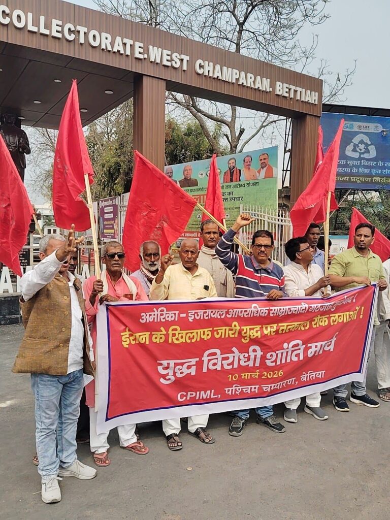 बेतिया।अमेरिका–इजरायल द्वारा ईरान के खिलाफ जारी युद्ध और पश्चिम एशिया में बढ़ते तनाव के विरोध में भाकपा माले के कार्यकर्ताओं एवं नेताओं ने आज बेतिया में युद्ध विरोधी शांति मार्च निकाला। मार्च के दौरान कार्यकर्ताओं ने “अमेरिका–इजरायल आपराधिक साम्राज्यवादी गठजोड़ मुर्दाबाद”, “ईरान के खिलाफ युद्ध पर तत्काल रोक लगाओ” जैसे नारे लगाए।