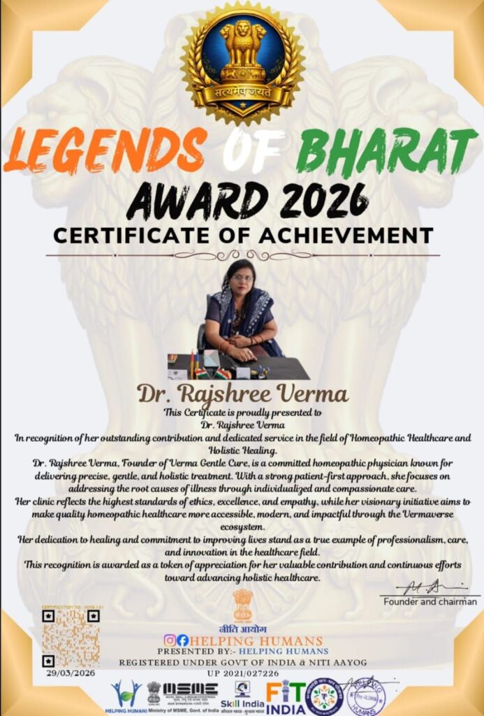 जमशेदपुर। स्वास्थ्य सेवा के क्षेत्र में उत्कृष्ट योगदान, समर्पण और नवाचार के लिए डॉ. राजश्री वर्मा को प्रतिष्ठित भारत का किंवदंती अवार्ड्स 2026’ से सम्मानित किया गया है। यह सम्मान उनके द्वारा होम्योपैथी चिकित्सा के माध्यम से समाज में सकारात्मक बदलाव लाने के सतत प्रयासों की राष्ट्रीय स्तर पर सराहना है।